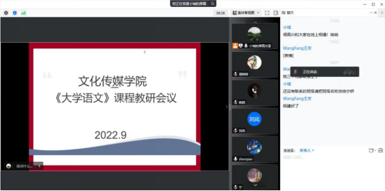 王刚副经理向各位参会的老师落实了新生的教学安排,确保各任课老师与新生班级的班导或者班干建立联系,并选定了各自的线上教学形式。然后,他就《大学语文》前4周的课程教学内容安排做了详细说明,并要求各任课老师严格按照师范专业认证工作的标准,做好过程性学习评价工作,他建议大家一学期至少布置三次平时作业,而且要存档,期末按照要求将过程性资料放进试卷袋。