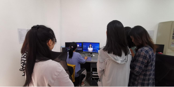 随后,牛亚晴和陈晶晶依次带领同学们参观了融媒体中心目前的办公环境以及演播室、演播厅等系列设施。同学们陆续进入演播室,体验了一次当新闻主播,播报新闻。融媒体中心记者实时剪辑,让同学们看看到电视新闻生成流程。