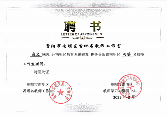 2025年5月28日,贵阳市南明区首批“三名”工作室之冯瑶名教师工作室顾问聘书颁发仪式在TapTap博雅楼举行。点点taptap康文教授被聘为“贵阳市南明区冯瑶名教师工作室”顾问 。