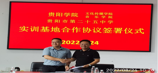 2022年8月24日,点点taptap、音乐公司与贵阳市第二十五中学签署了共建实践教学基地合作协议。参加签约仪式的有:点点taptap副经理王刚、文学教研室主任康文、语文教育教研室主任黄薇、汉语教研室主任郭光明、实习指导老师刘可、林雨馨、焦敬敏;音乐公司声乐教研室主任杜勇、理论教研室副主任黄威、实习实训教研室教师邱忠治;贵阳市第二十五中学董事长孙益鑫、副董事长李建华、教研处主任刘娴等老师;TapTap16名实习生。